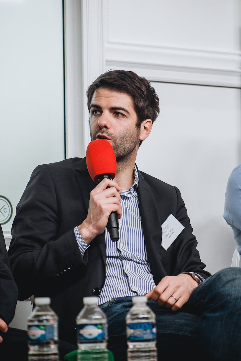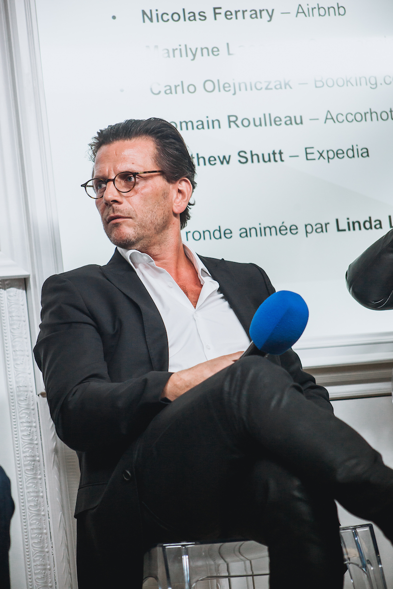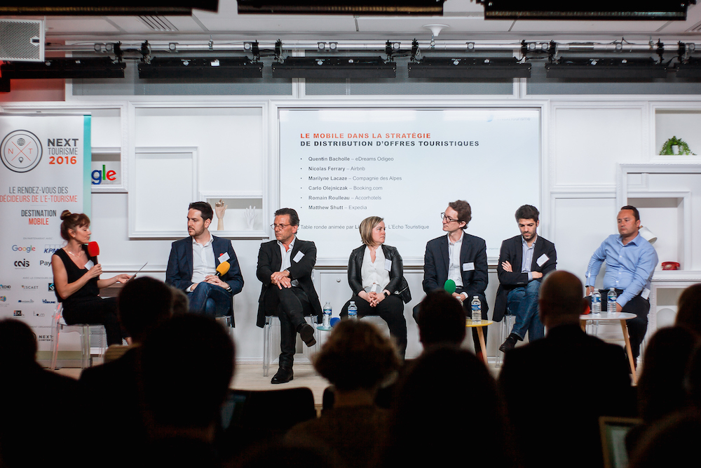 De gauche à droite, Linda Lainé (L’Echo Touristique), Matthew Shutt (Expedia), Carlo Olejniczak (Booking.com), Maryline Lacaze (Compagnie des Alpes), Quentin Bacholle (eDreams-Odigeo), Nicolas Ferrary (Airbnb), Romain Roulleau (Accorhotels) – Next Tourisme 2016